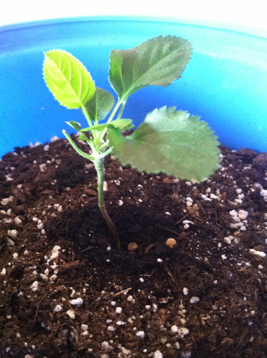 There are 2 images below of my only one cherry tree sprout! It is slowly growing. At least it is alive! As you can see in the images below it has new tiny leaves maybe starting to grow in the middle where the stem is.